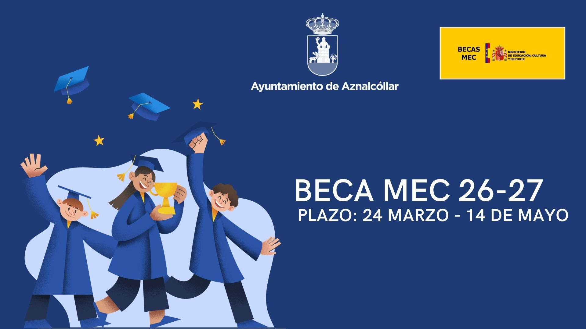 Asimismo, se comunica la apertura del plazo para la solicitud de las Becas del Ministerio de Educación para el curso 2026-2027, convocadas por el Ministerio de Educación y Formación Profesional, cuyo periodo de solicitud estará comprendido entre el 24 de marzo y el 14 de mayo de 2026.