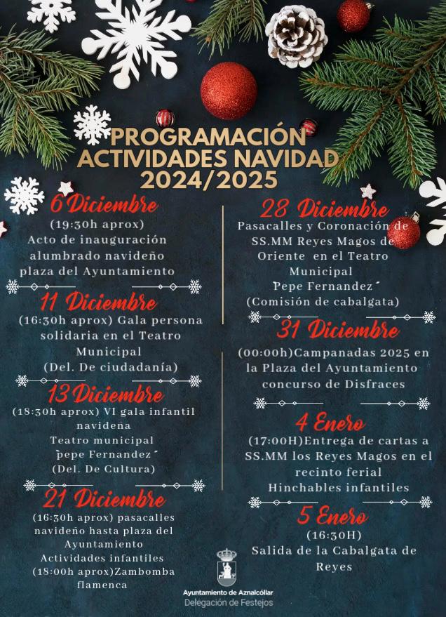 El Ayuntamiento de Aznalcóllar vuelve a preparar una completísima programación para la Navidad 2024/2025 para todo el municipio! Con actividades de todo tipo y para todos los públicos