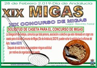 XIX CONCURSO DE MIGAS SOLICITUD DE CASETA PARA EL CONCURSO DE MIGAS La Delegación de Festejos, comunica que toda persona, asociación o colectivo que este interesado en coger una caseta para el día del Concurso de Migas (Día de Andalucía) 28/2/19, pueden echar la solicitud en la oficinas del Ayto. hasta el 8/2/19.SE DEBERÁ ABONAR 20 ? DE FIANZA, QUE SERÁN DEVUELTA UNA VEZ FINALIZADO EL ACTO. Después de esta fecha no se aceptaran ninguna solicitud ,por motivos de organización del evento.