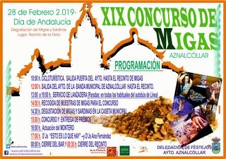 28 de Febrero 2.019- Día de Andalucía- 10:00 h. CICLOTURÍSTICA. SALIDA PUERTA DEL AYTO. HASTA EL RECINTO DE MIGAS 12:00 h. SALIDA DEL AYTO. DE LA BANDA MUNICIPAL DE AZNALCÓLLAR HASTA EL RECINTO. 13:00 a 19:00 h. SERVICIO DE LANZADERA (Paradas: en todas las habituales del autobús de Linea) 14:00 h. RECOGIDA DE MUESTRAS DE MIGAS PARA EL CONCURSO 14.30 h. DEGUSTACIÓN DE MIGAS Y SARDINAS EN LA CASETA MUNICIPAL. 15.00 h. CONCURSO Y ENTREGA DE PREMIOS 16:00 h. Actuación del MONTERO 17:00 h. D`Js ?ESTO ES LO QUE HAY? --y D?Js Ana Fernández 00:00 h. CIERRE DEL BAR Y 00:30 h. CIERRE DEL RECINTO